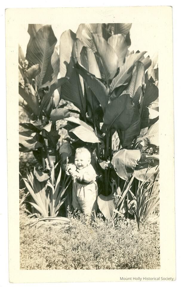 Toddler standing before large-leafed plants. From back: "Edward Clemo Fubb / 6 1/2 mt / birthday Feb. 5th"