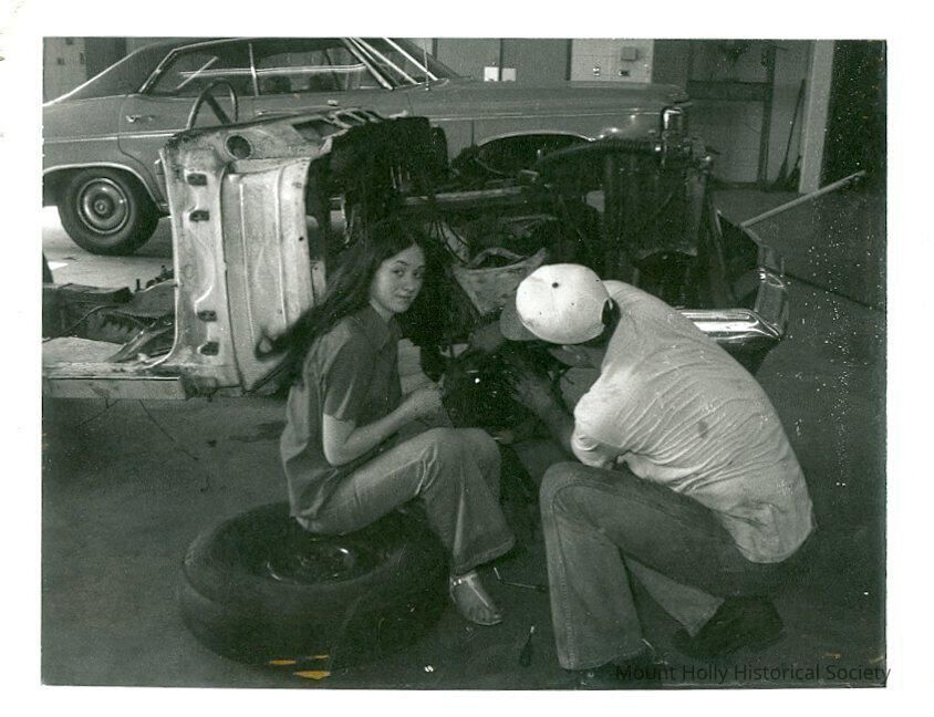 Black-and-white photo of a teenaged white girl, seated with face turned to camera, with man (back to camera) working on car engine in garage; from back "Donna Frisbee / Dale Marten / Mount Holly / 'Donna, are you listening?'"