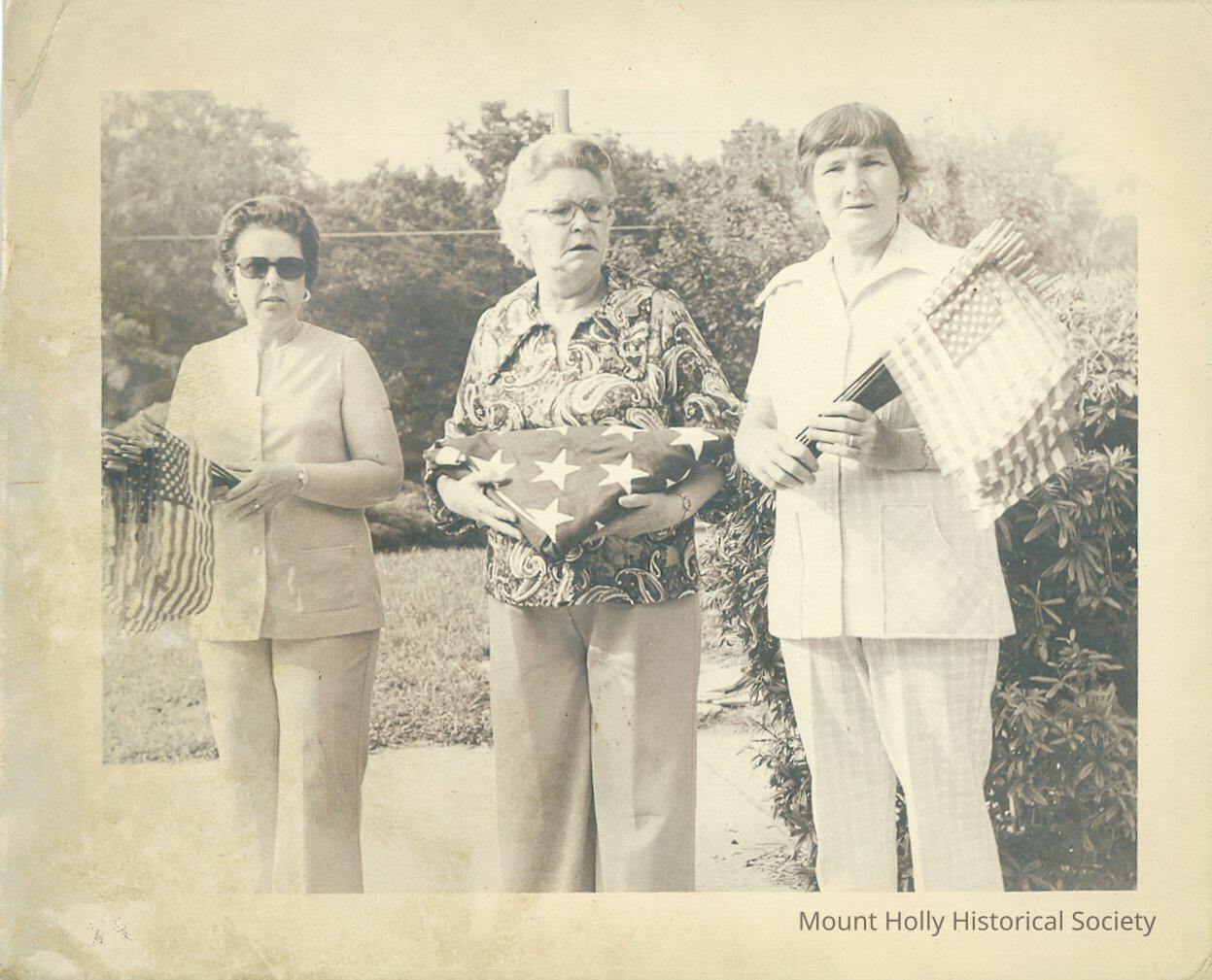 Three older white women standing in a row outside; the two outer women hold miniature flags, while the woman in the center holds a folded flag; from back "Big & little"