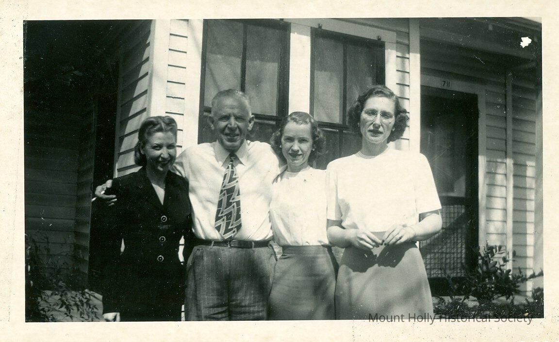 Four white people (one older man and woman, two younger women) in a row outside a house, all well-dressed