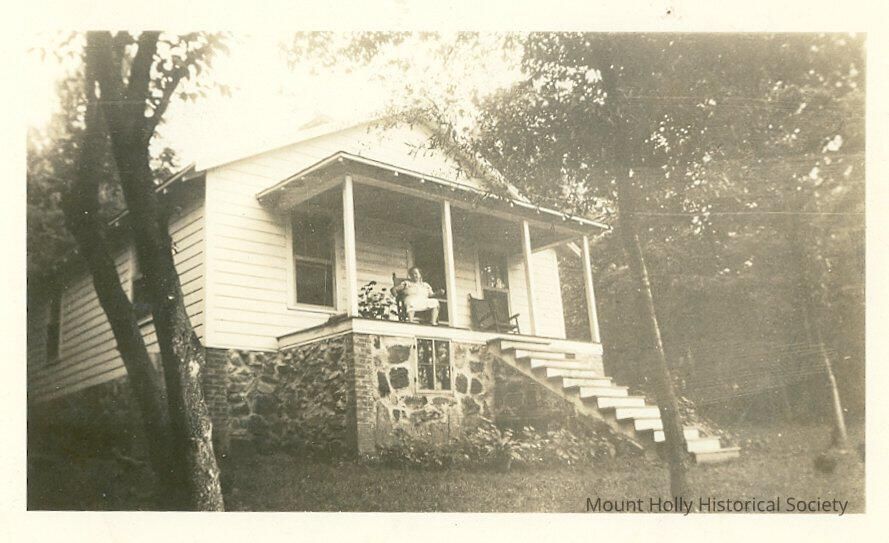 Black-and-white photo of a house, with a woman seated in a rocking chair on front porch; from back "Dogwood Springs Home Belmont R.F.D."