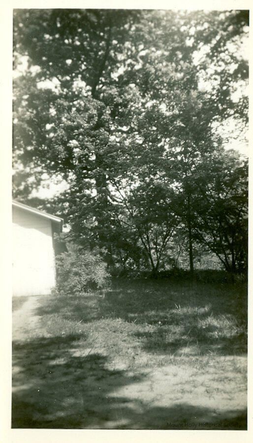 Black-and-white photo of a house (to photo's side) surrounded by trees