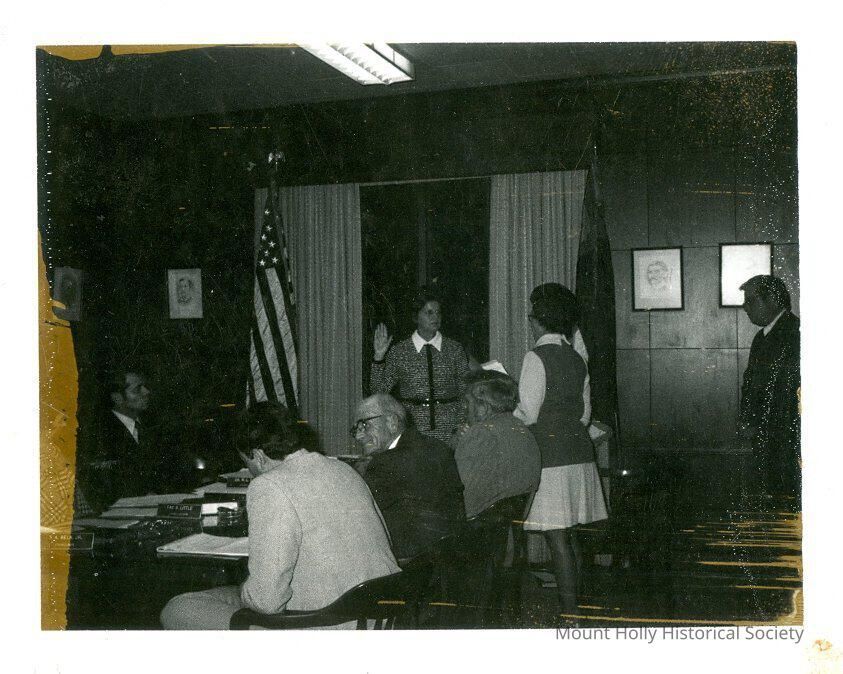 Eight white men and women in an official room; five are seated while one woman has raised her right hand; another woman stands in front of her with her back to the camera