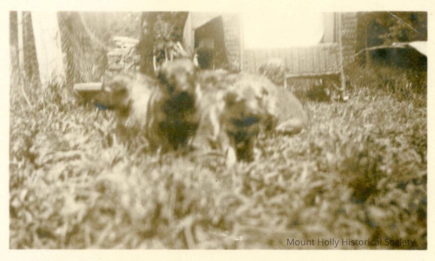 Blurry photo of four puppies in a yard; photo taken at eye level with the puppies