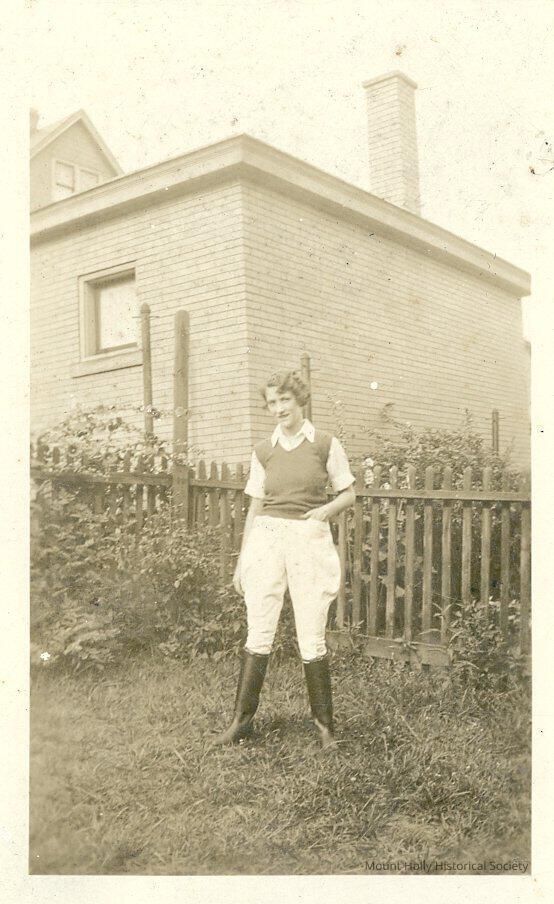 Unidentified woman in knee-high boots in yard, standing before wooden fence at corner of house; from back "from Nims Box #23"