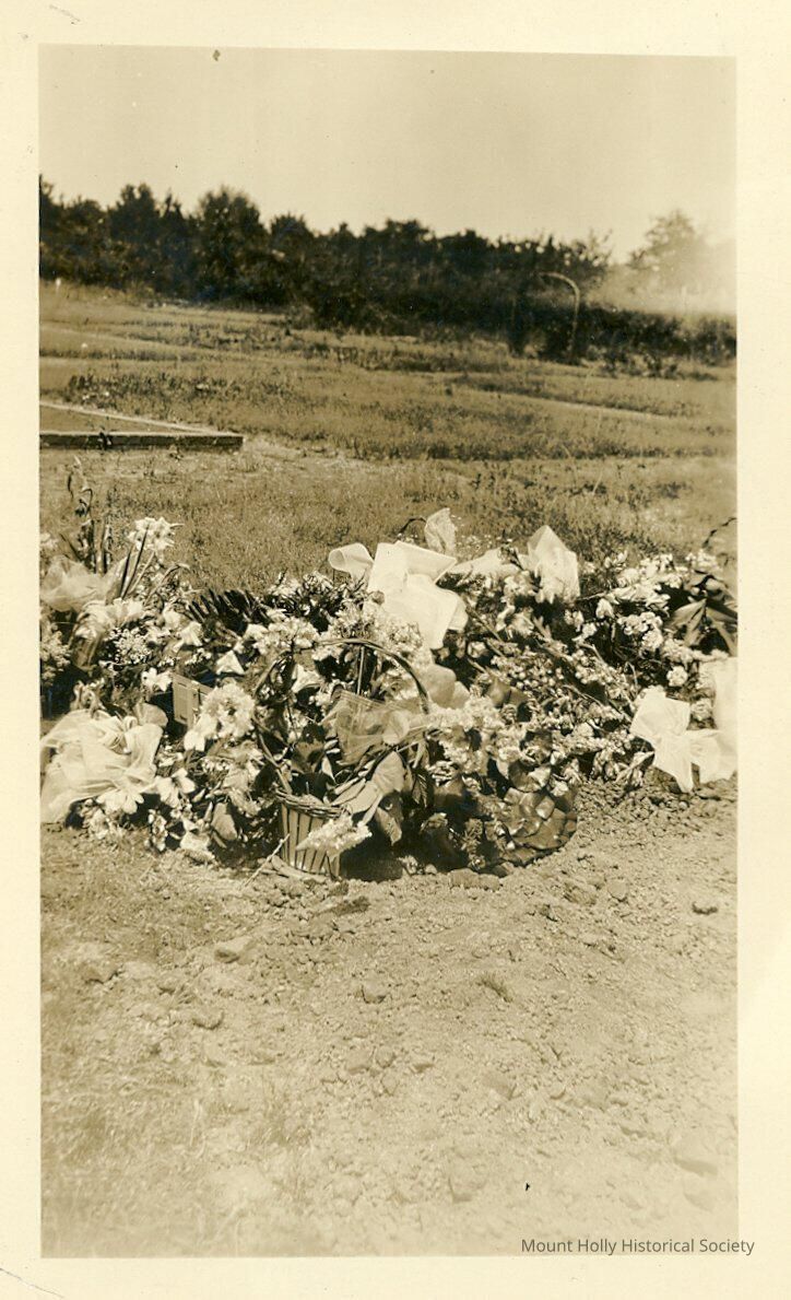 Black-and-white photo of several floral tributes over a fresh grave in the foreground, with a wide grassy area in the background