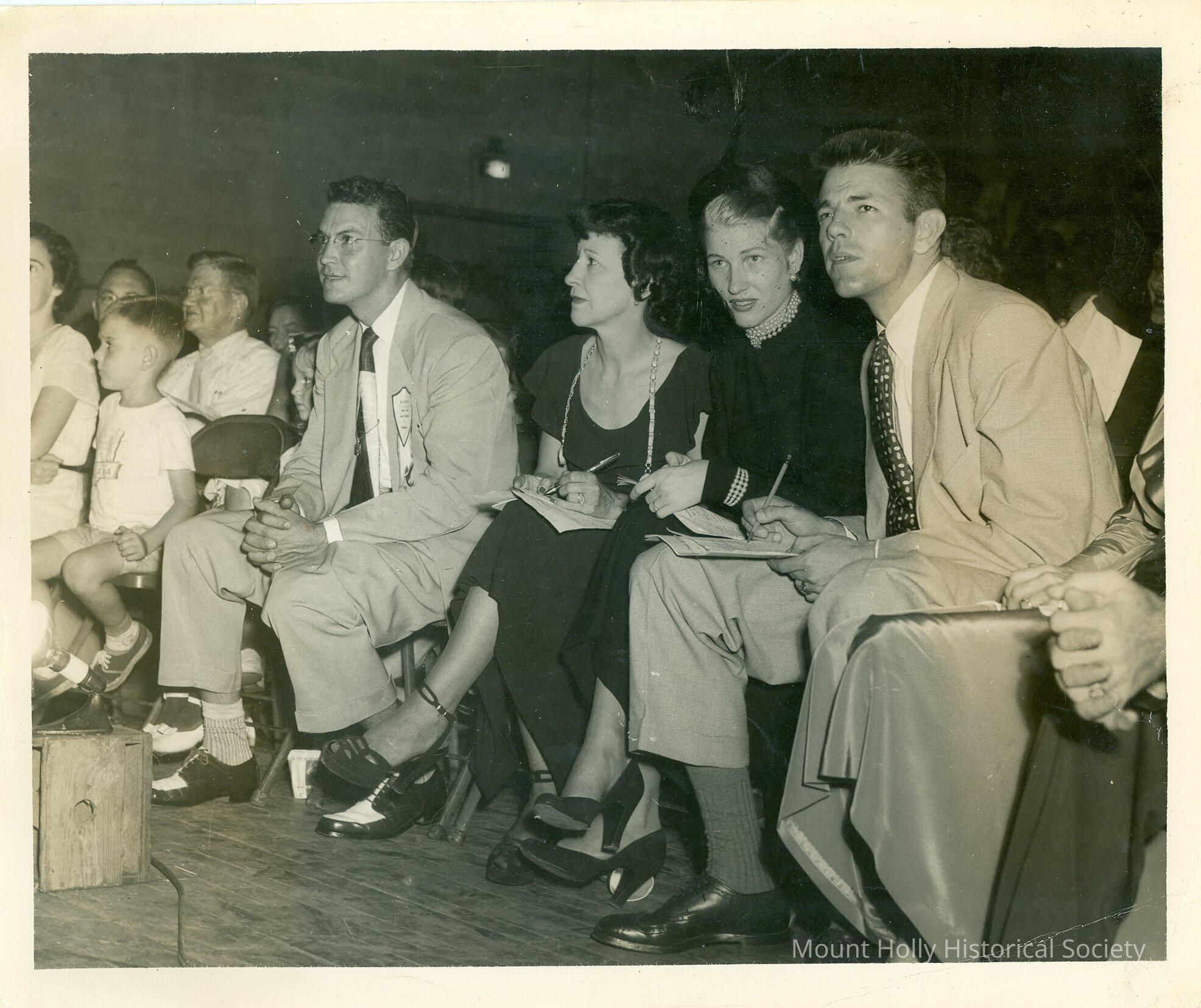 Close-up black-and-white photo of four white adults (two men, two women) seated in auditorium, three of them taking notes