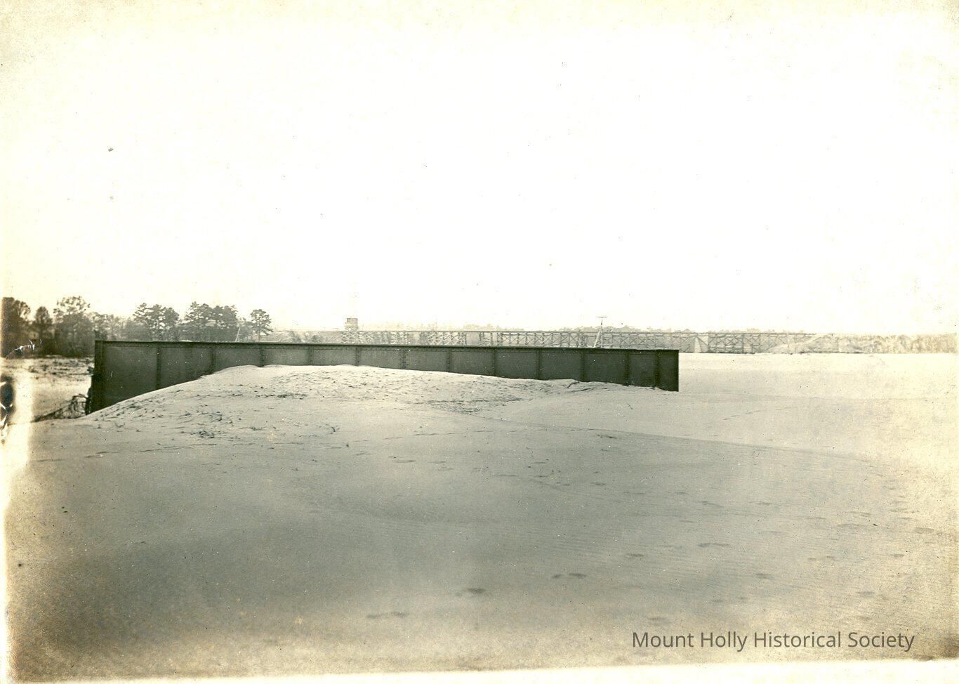 Black-and-white photo of a broad, sandy expanse, with retaining wall in middle ground and railroad trestle in distance
