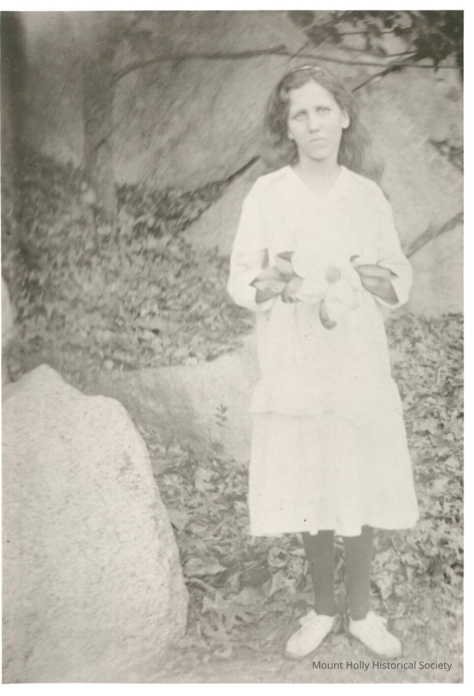 From back: "Inez Bumgarner Lewis / sister of Amos / Daughter of Alfred Jay"; white teenaged girl with a sad countenance holding a magnolia flower outside