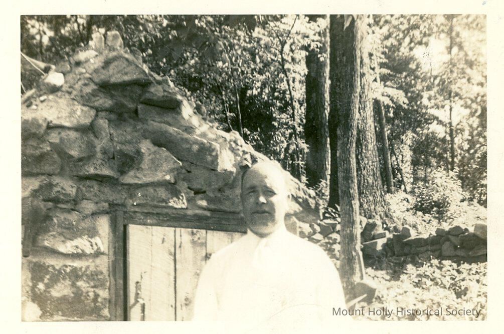 Unidentified older white man outside, in front of stone wall with door and trees behind; black-and-white photo taken from chest up