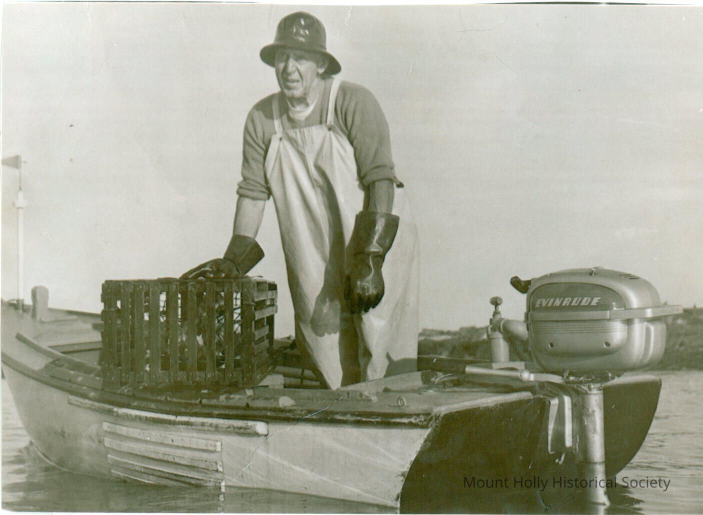 Mark Tucker: Older white man on boat with outboard motor, wearing heavy gloves and overalls, facing camera with right hand on a crate or lobster trap