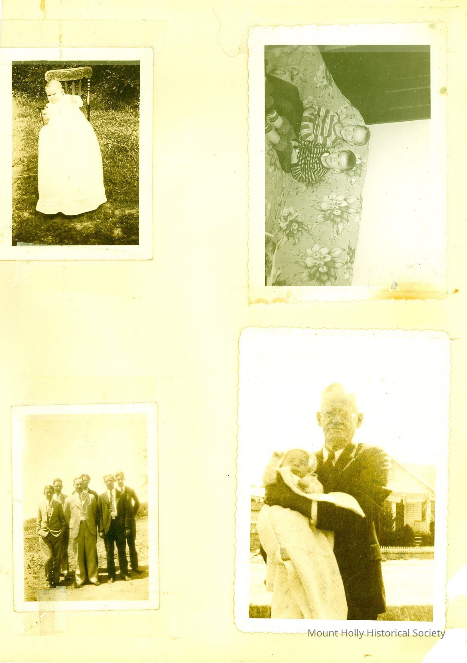 Four black-and-white photos taped to a sheet: Top left = two white boys on floral couch; top right = older white man holding infant; lower left = white infant in high chair; lower right = six young white men in suits and ties