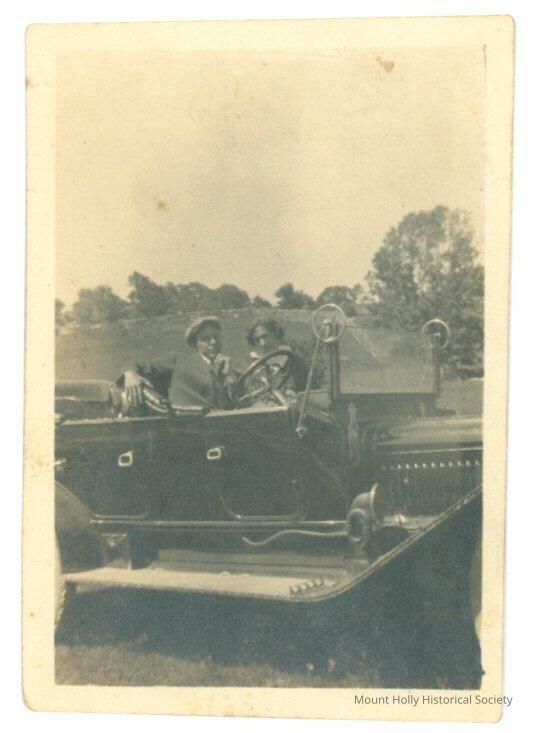 Young white couple, well-dressed, in an open-topped car; from back "Mack & Ethylene Tucker?"