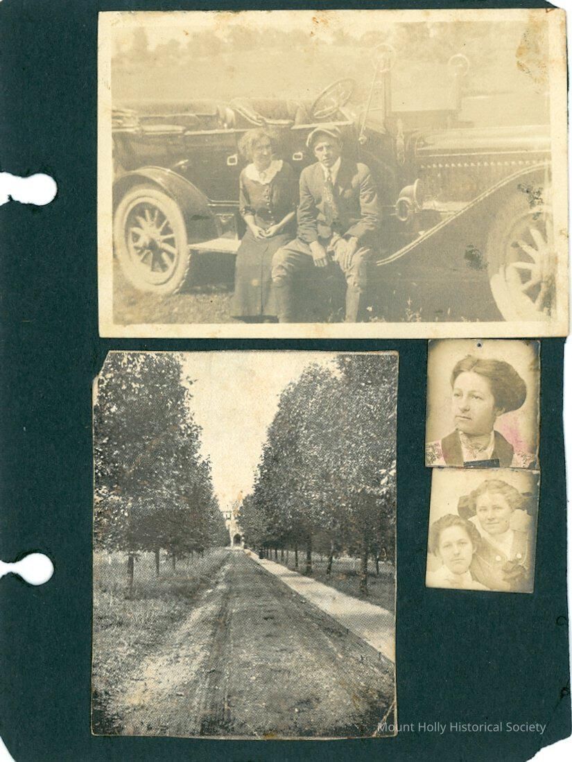 Four black-and-white photos on black paper: Young white couple sitting on a car's runner; tree-lined avenue; young white woman and two older white women; from back "Mack & Ethylene Tucker"