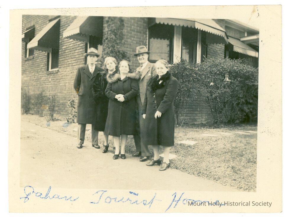 Five older white men and women, in winter coats, standing outside house; from back "(Guests?, Louie + Herbert Graham, Nell Anderson)"