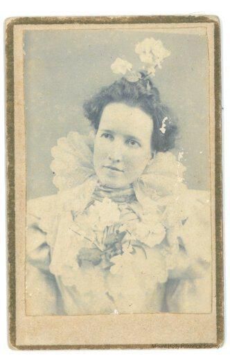 Young white woman in elaborate dress with lace collar and flowers, from chest up, facing left; from back "Patti Shankle"