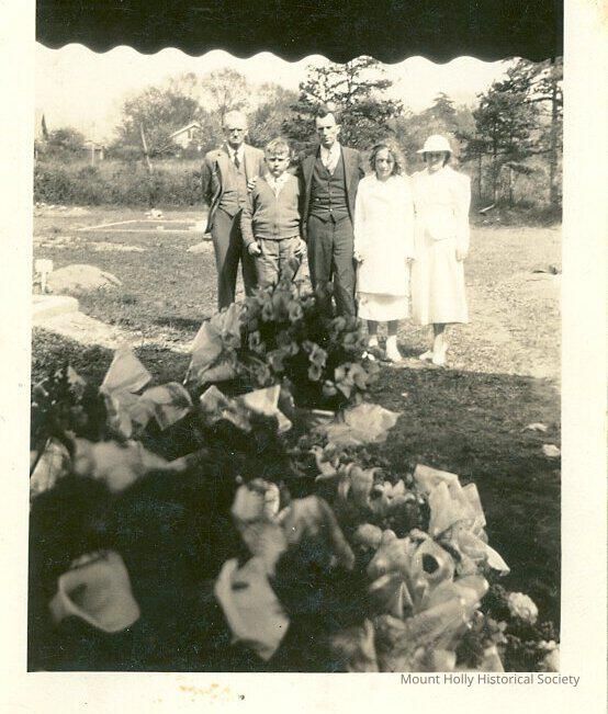 Five white people (two men, one boy, two women) looking at floral tributes for grave; view from underneath grave canopy, facing people