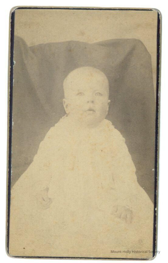 Black-and-white photo of an infant, clad in white lying on a black cloth; from back "Mary Hardister (Mamie Tucker's first cousin)"