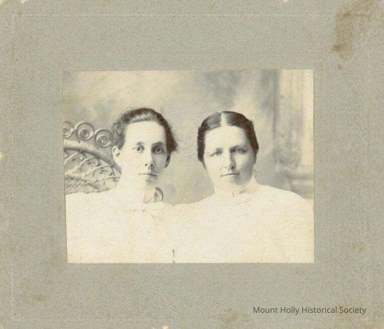 Two white women, both dressed in white, from shoulders up, facing camera; from back "Clara Shuford / Carrie Wilkinson Russell"