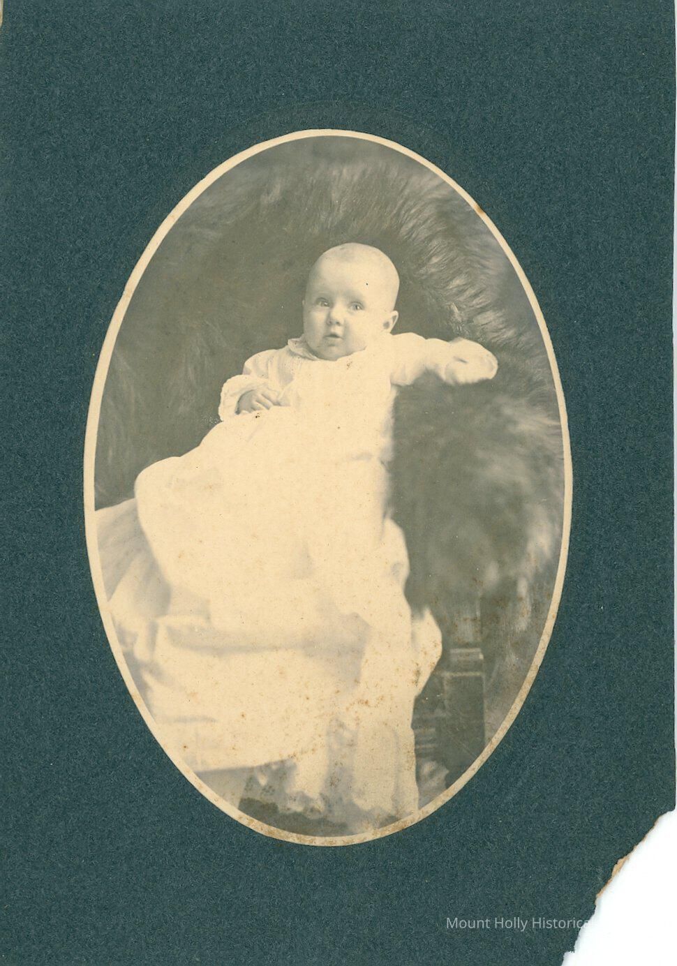 Black-and-white photo of an infant, clad in white, seated on a fur-covered chair; from back "Little Mamie Tucker / 5 Mo. 26 d's old / May 12th, 1902)"