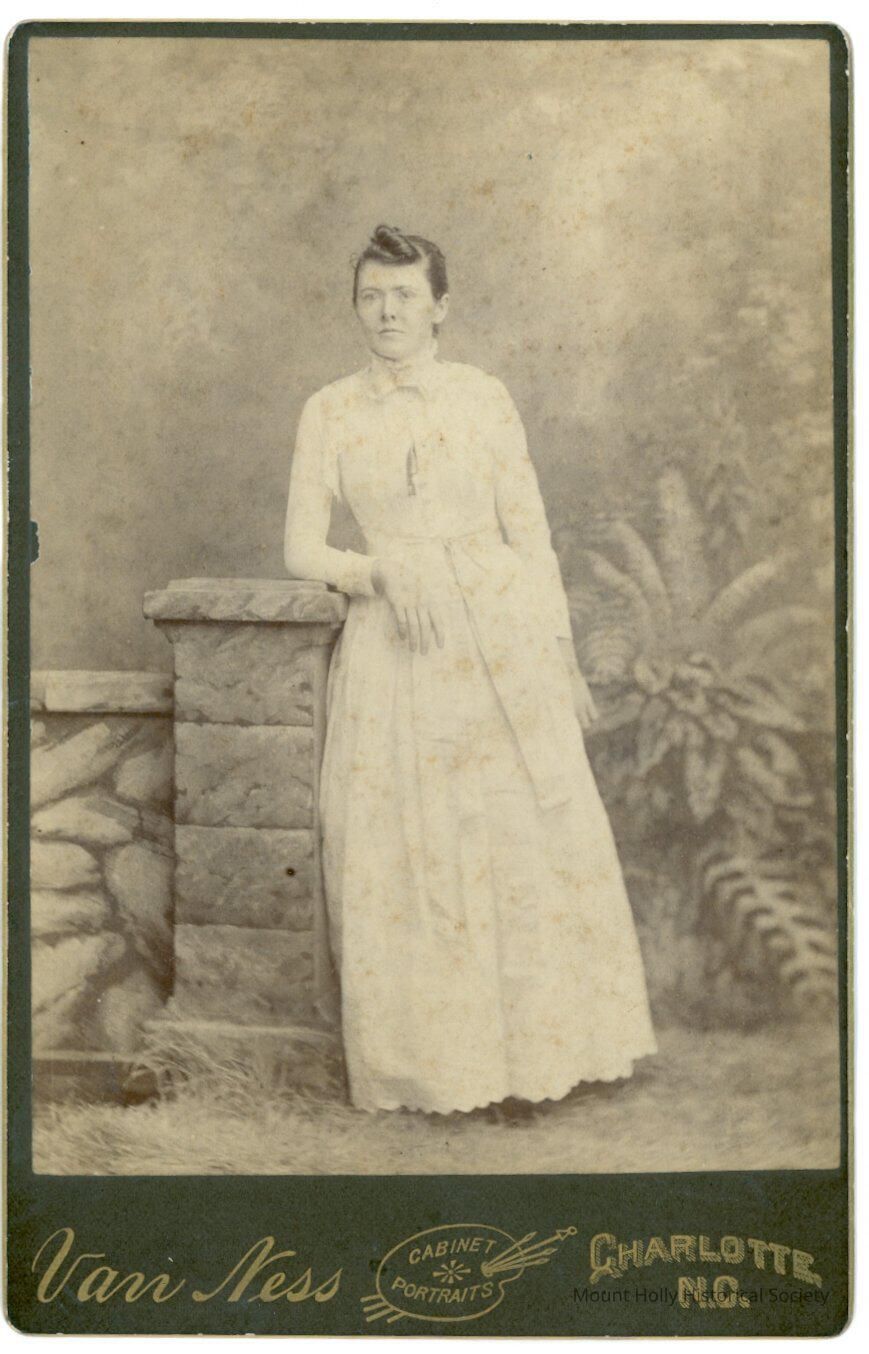 Yound white woman in white dress, facing camera and looking left, leaning on stone pillar in a studio; from back "Mary Garrison Tucker"