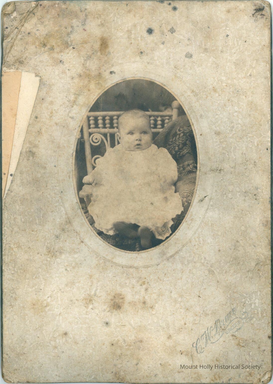 White infant in white dress, seated on chair; from back "Little Lucial [?] Mosely [?] / 4 Months Old"