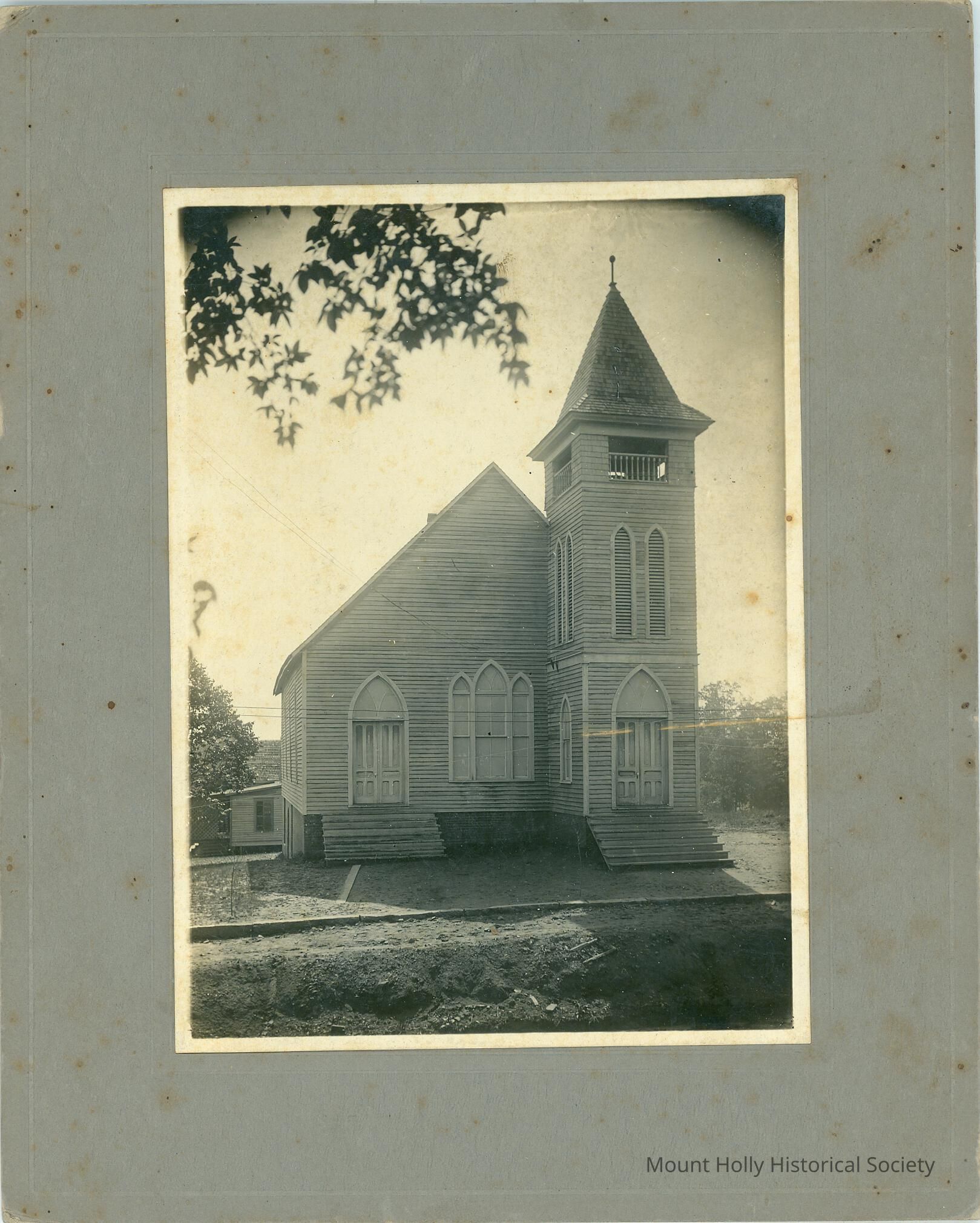 Black-and-white photo of Old First Baptist Church in Mt. Holly, NC