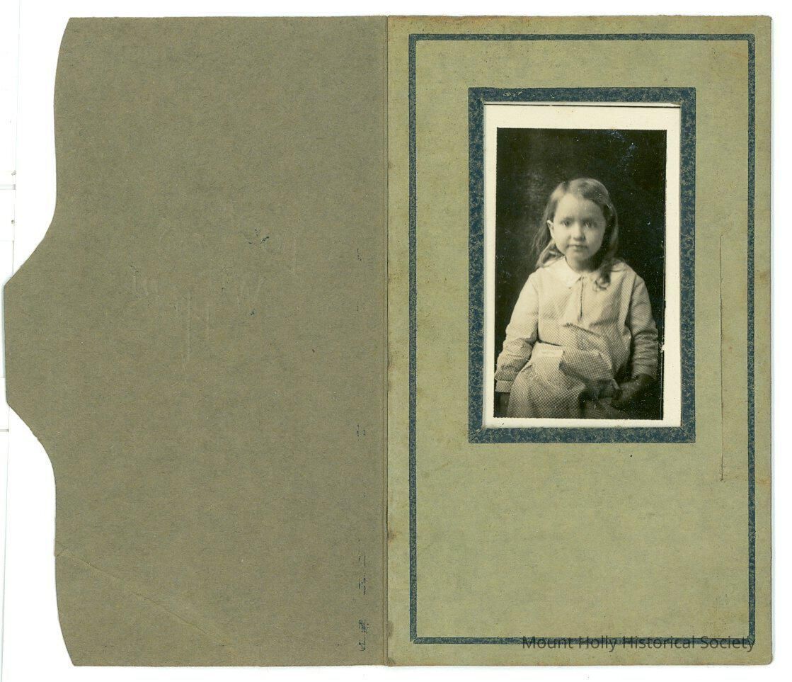 Nearly full-length photo of Mae Tucker at nine years old, wearing a simple dress, seated and looking at camera