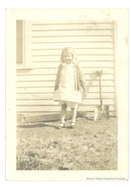 Photo of Mae Tucker at nine years old, standing outside in front of a house, with a shovel leaning against the wall to her left