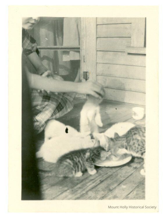 Photo of a woman feeding six kittens on the floor: One takes food from her hand while the others eat from a dish