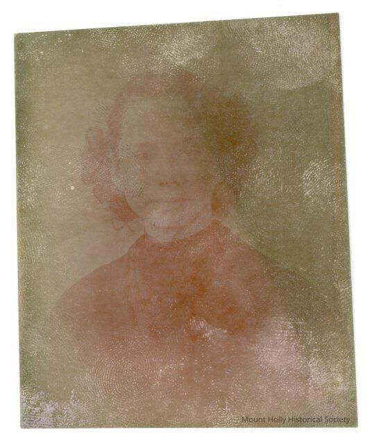 Faint black-and-white photo of a young white woman in a black dress, from chest up, looking directly at camera