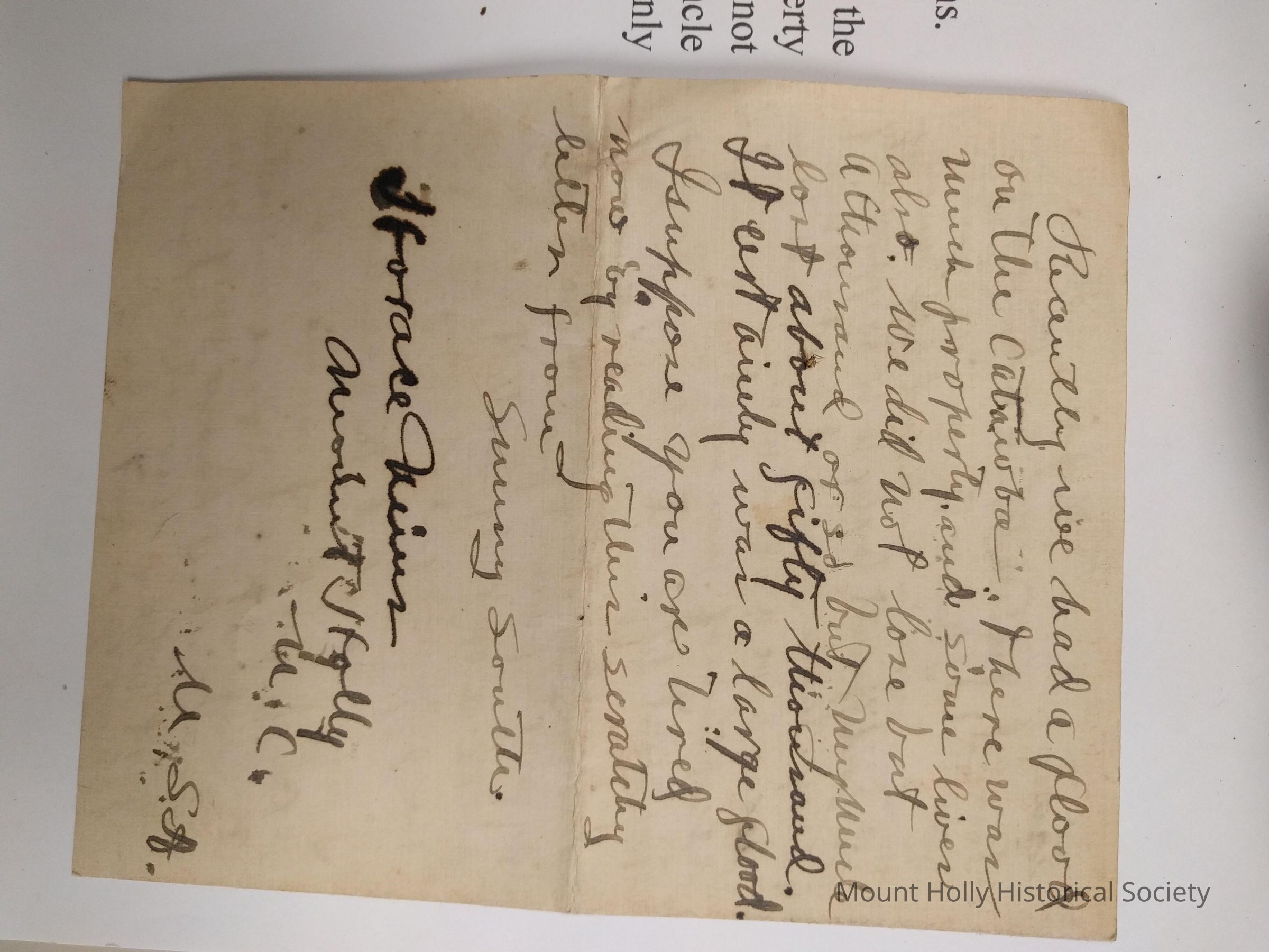 "Recently we had a flood on the Catawba. There was much property lost and some lives also. We did not lose but a thousand or so but my uncle lost about fifty thousand. It certainly was a large flood. Suppose you are tired now by reading this scratchy letter from Sunny South. Horace Nims. Mount Holly, NC, USA"