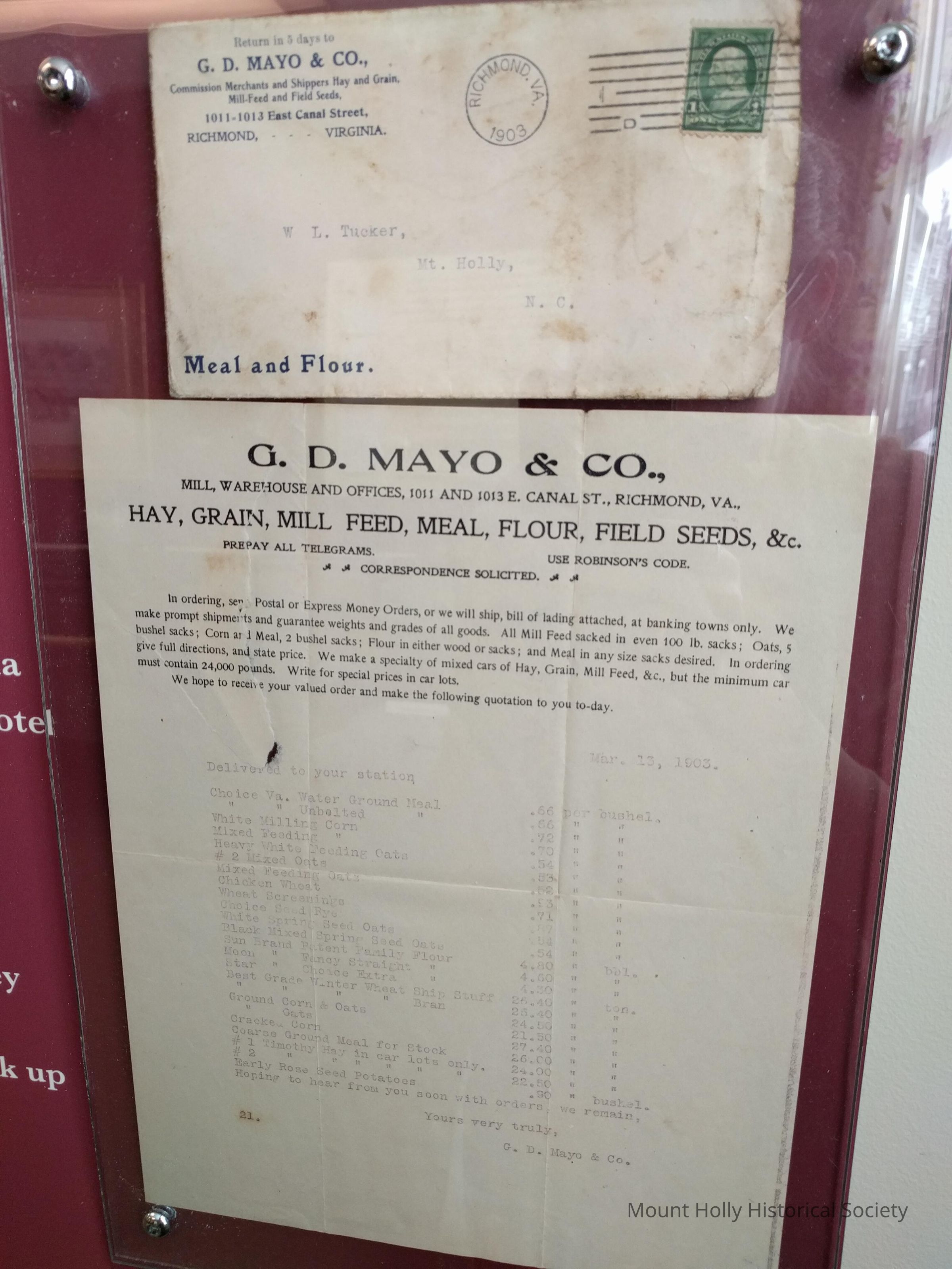Receipt with enveloped mailed from G.D. Mayo & Co. in Richmond, VA for W.L. Tucker, itemized list of goods "Meal and Flour" Tucker's Cash Grocery
