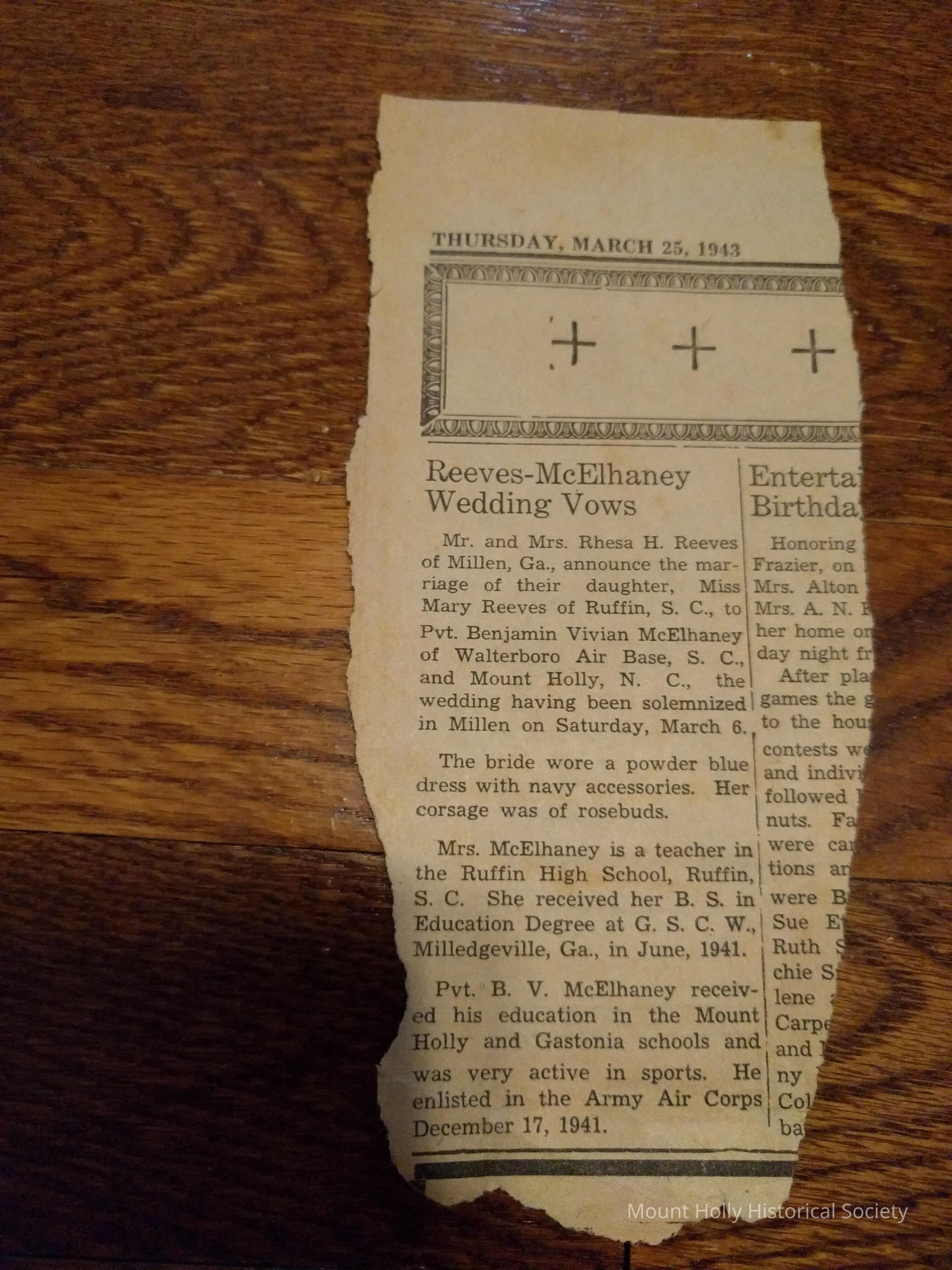 Wedding announcement news clipping, Mary Reeves and Benjamin McElhaney