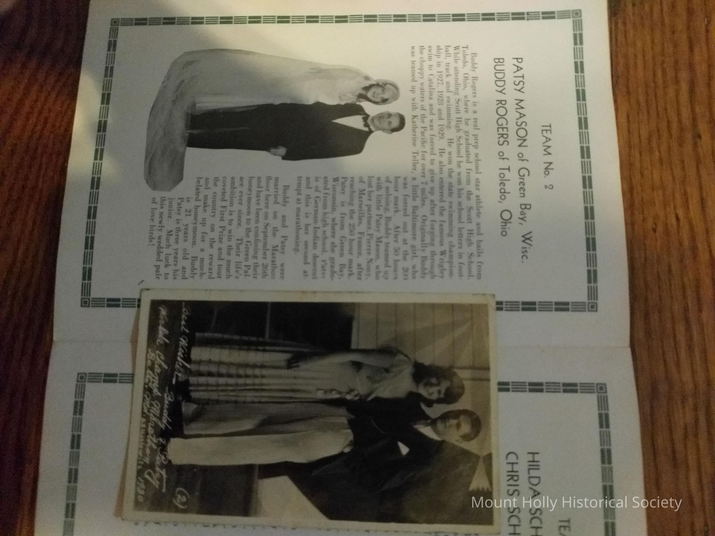 Program, World's Championship Dance Endurance Marathon with signed picture postcard from Buddy Rogers and Patsy Mason
