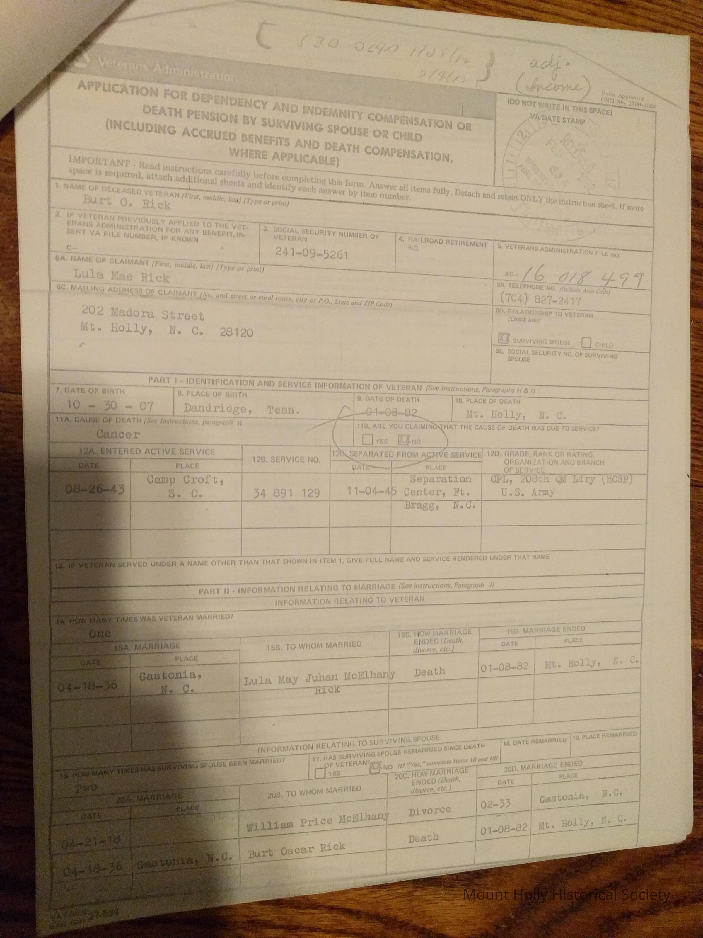 Veterans Administration benefits claim, Burt Rick, Lula Mae Rick