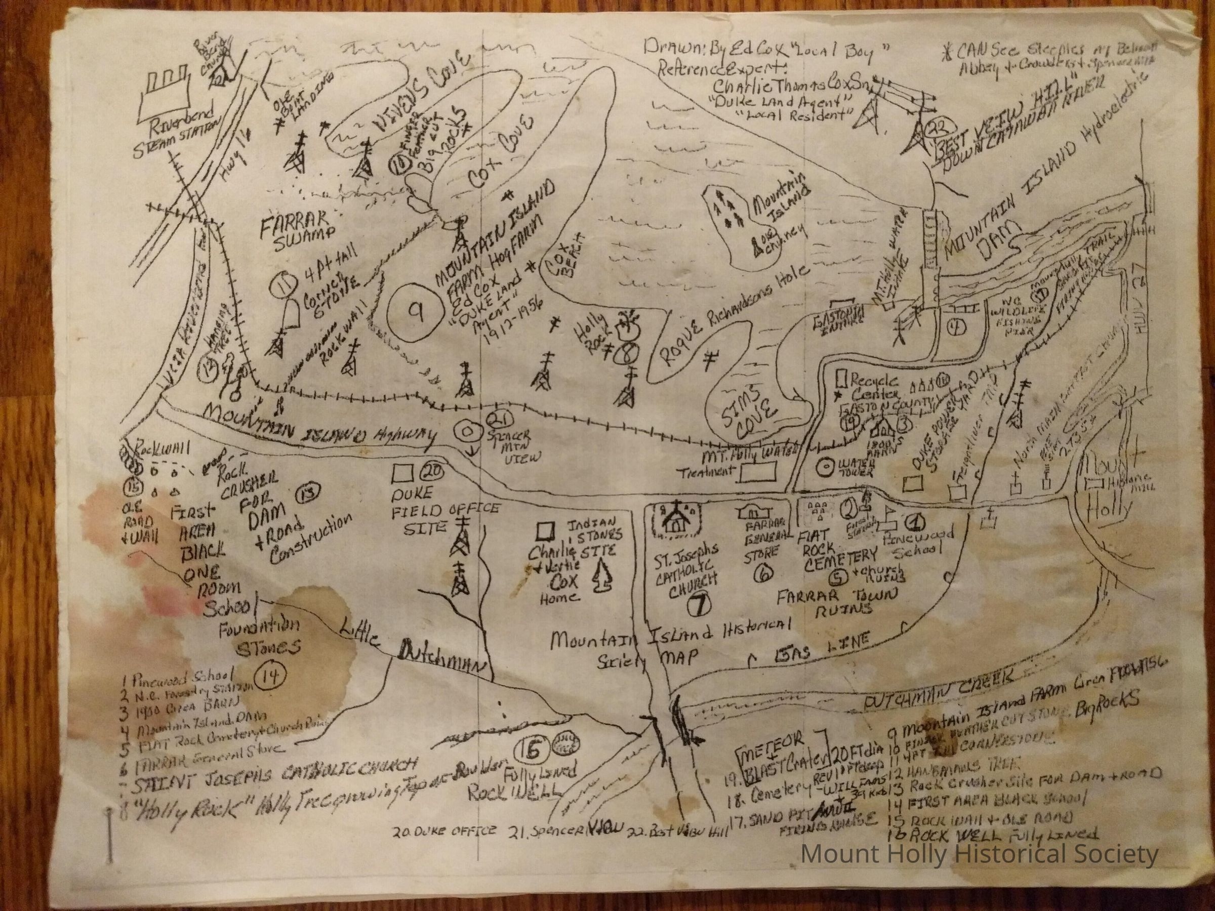 Mountain Island Historical Society handdrawn map and extensive descrition, Edward Leroy Cox and Charlie Thomas Cox