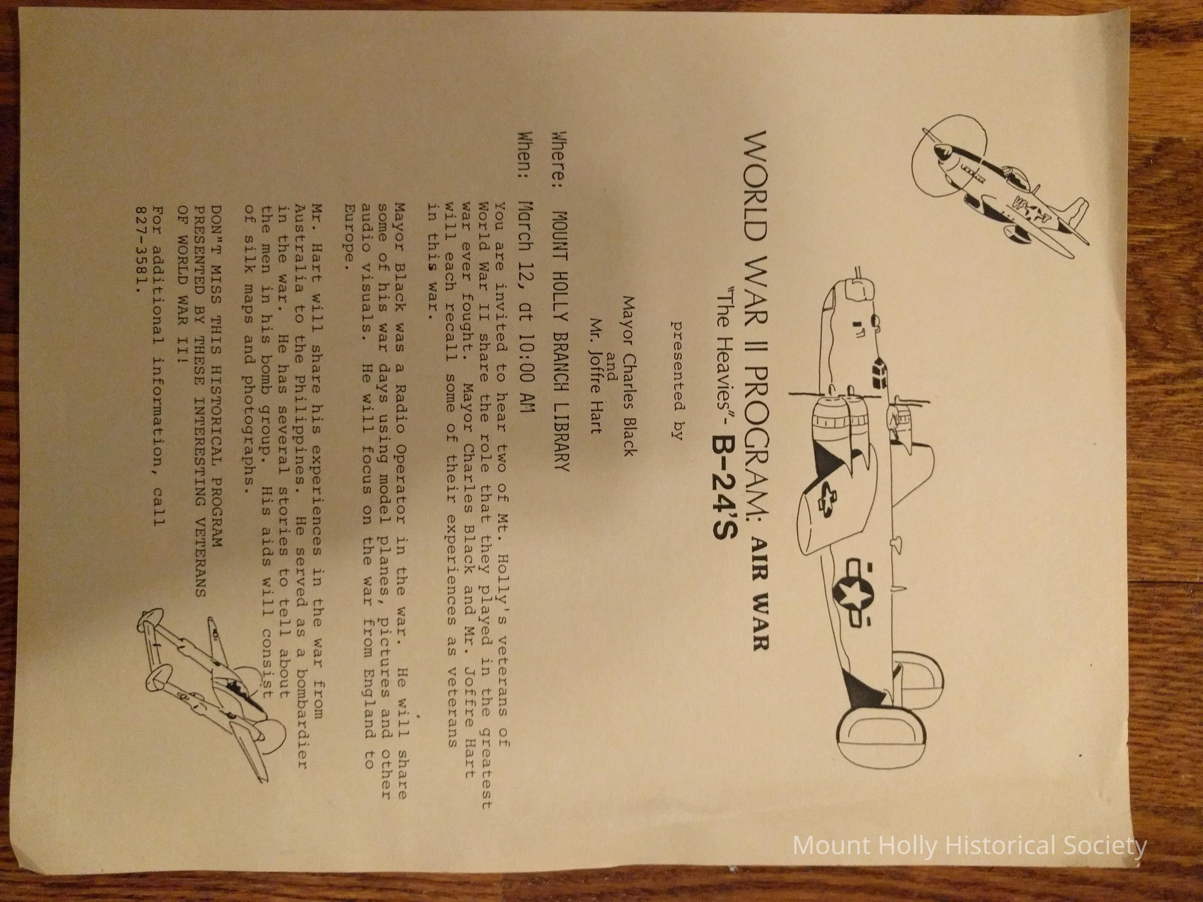 Program for WWII at Mount Holly Library by Charles Black and Joffre Hart