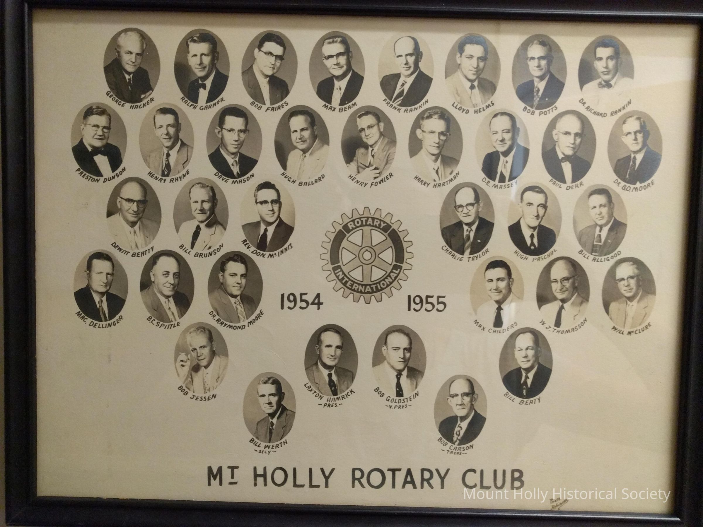George Hacker, Ralph Garner, Bob Faires, Max Beam, Frank Rankin, Lloyd Helms, Bob Potts, Dr. Richard Rankin, Preston Dunson, Henry Rhyne, Dave Mason, Hugh Ballard, Henry Fowler, Harry Hartman, O.E. Massey, Paul Derr, Dr. B.D. Moore, Dewitt Beatty, Bill Brunson, Reverend Don McInnis, Charley Taylor, Hugh Paschal, Bill Alligood, Mack Dellinger, B.C. Spittle, Dr. Raymond Moore, Max Childers, W.J. Thomasson, Will McClure, Bob Jessen, Bill Beatty, Bill Werth (Secretary), Laxton Hamrick (President), Bob Goldstein (Vice President), Bob Carson (Treasurer)