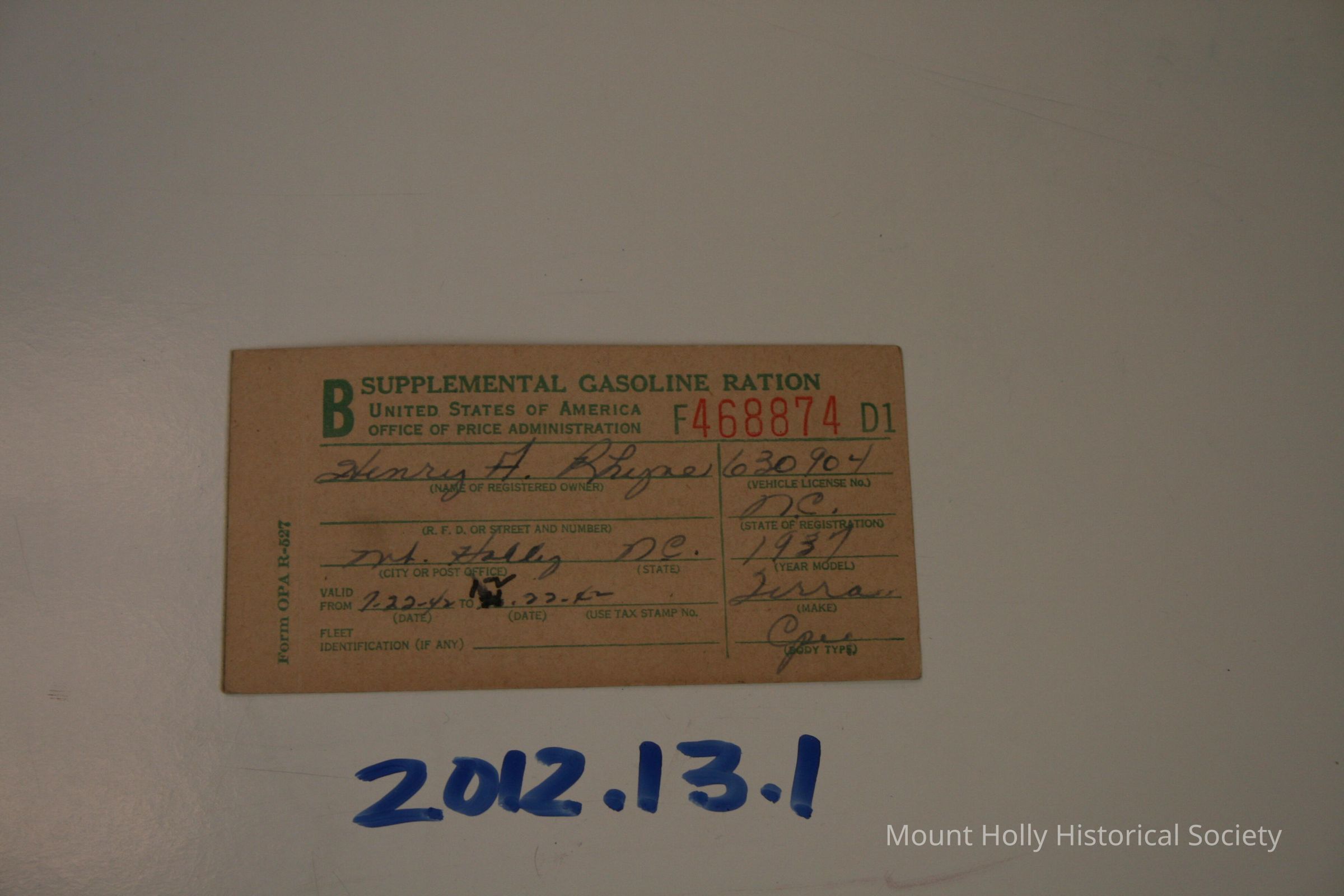 Supplemental gasoline ration for Henry H Rhyne F468874D1