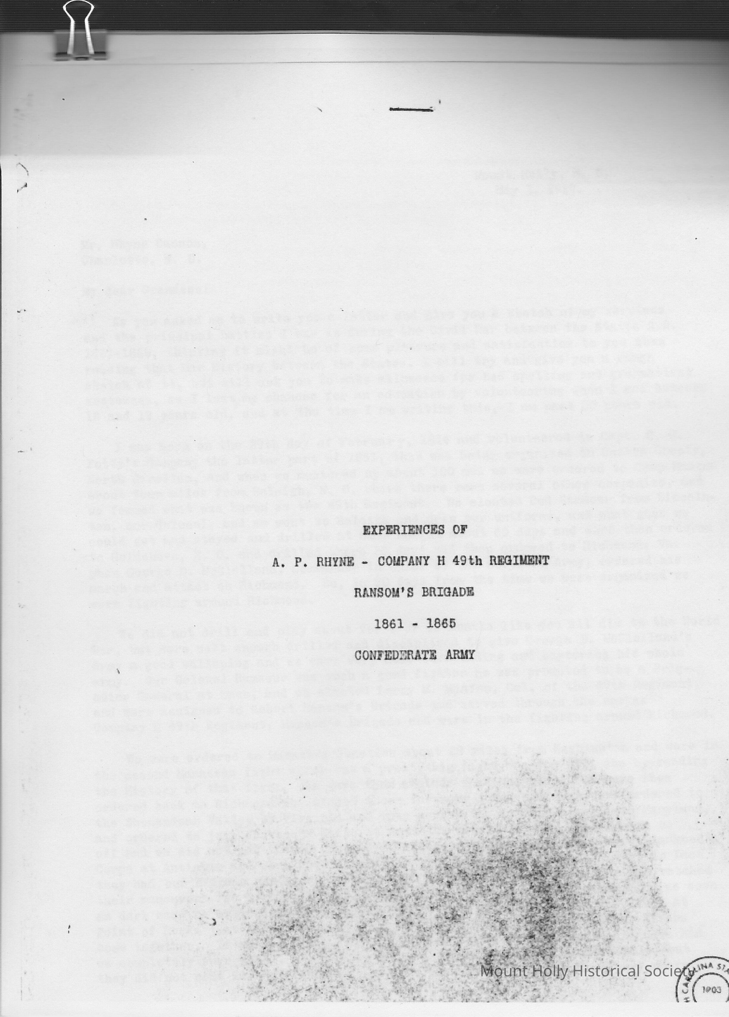 Copy - Experiences of A.P. Rhyne - Company H 49th Regiment, Ransom's Brigade Conferedate Army 1861-1865