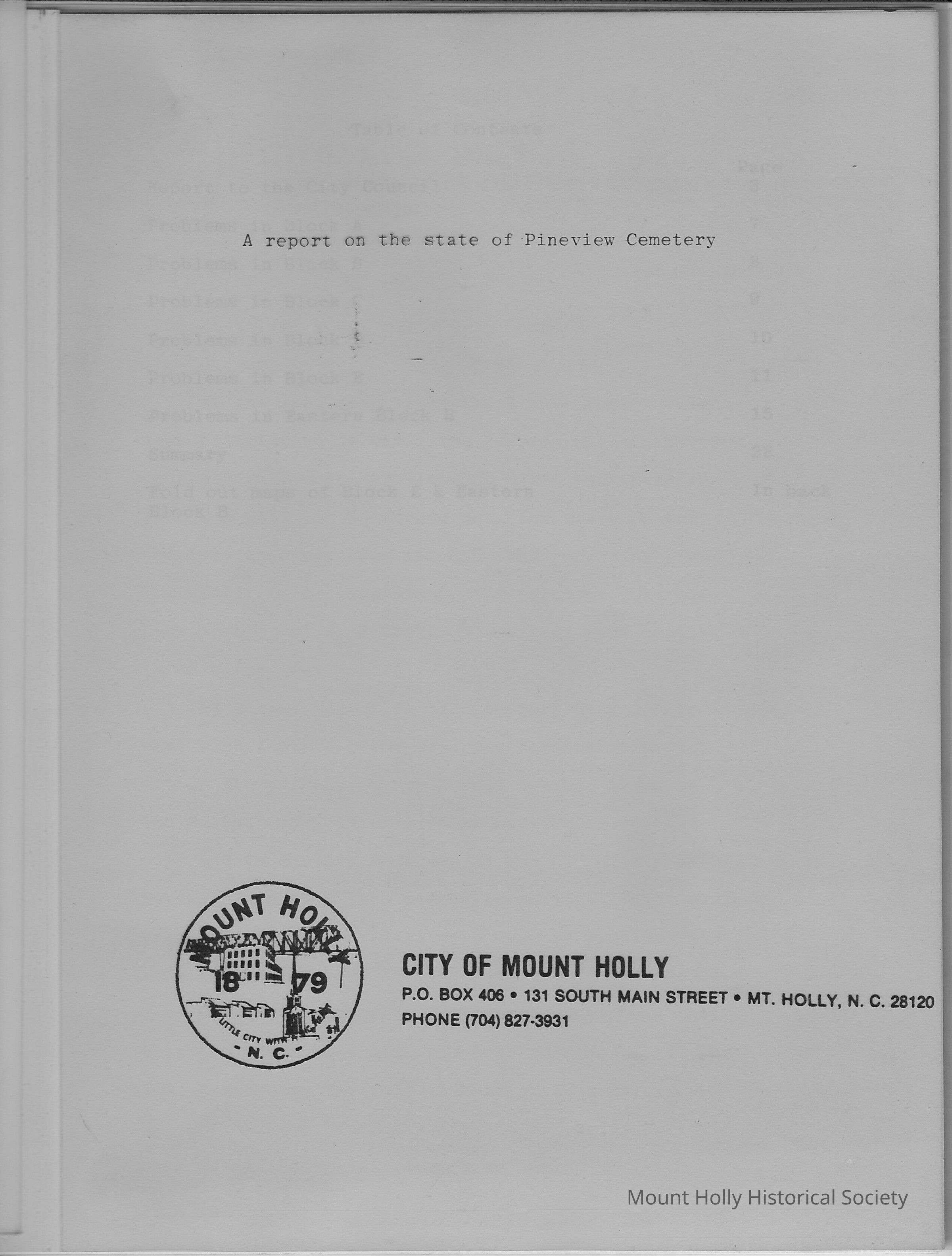 "A report of the state of Pineville Cemetary" City of Mount Holly Survey