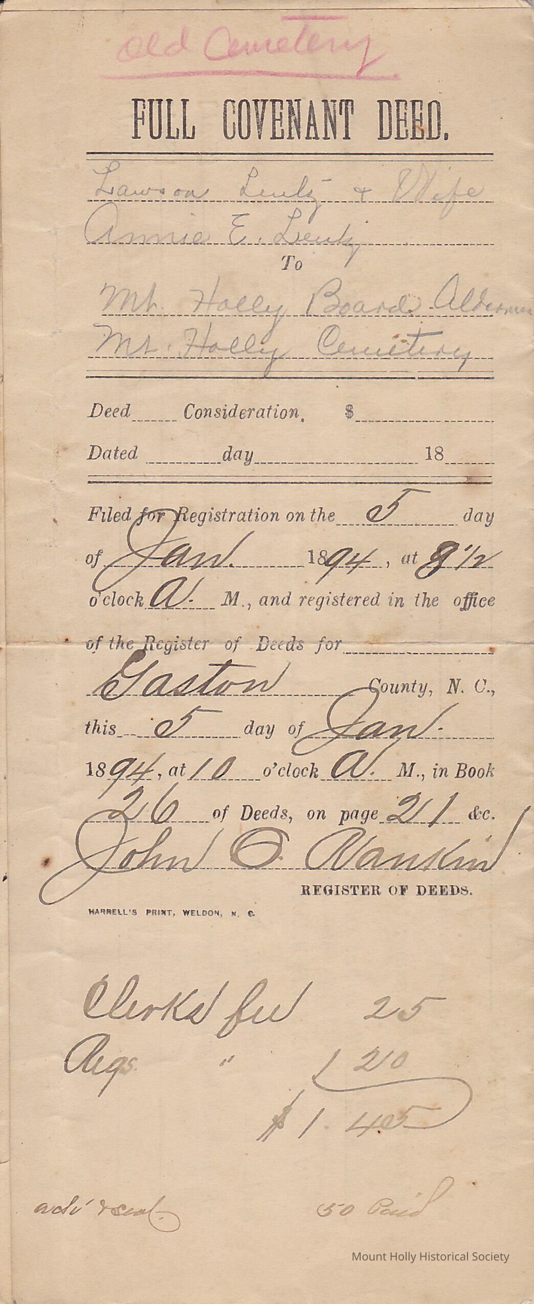 Cemetery Deed for Mount Holly Cemetery - Lawson Lentz and Annie Lentz