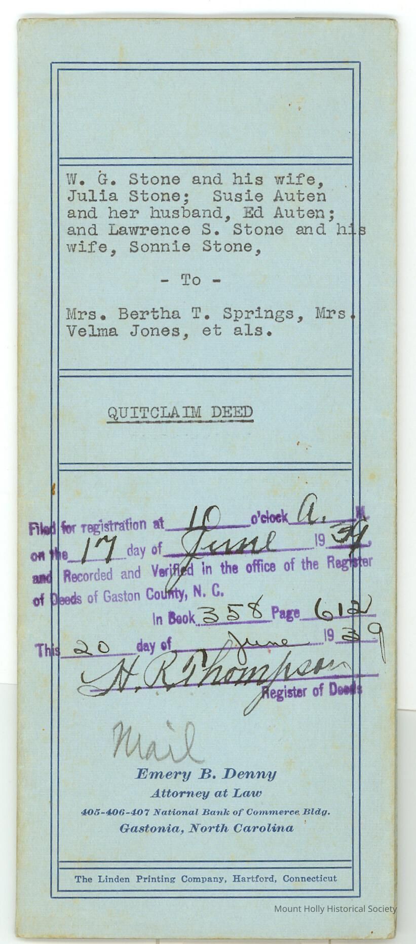 Quitclaim deed of W.G. & Julia Stone, Susie & Ed Auten, & Lawrence S. & Sonnie Stone to Bertha Springs et al. (Main St.)