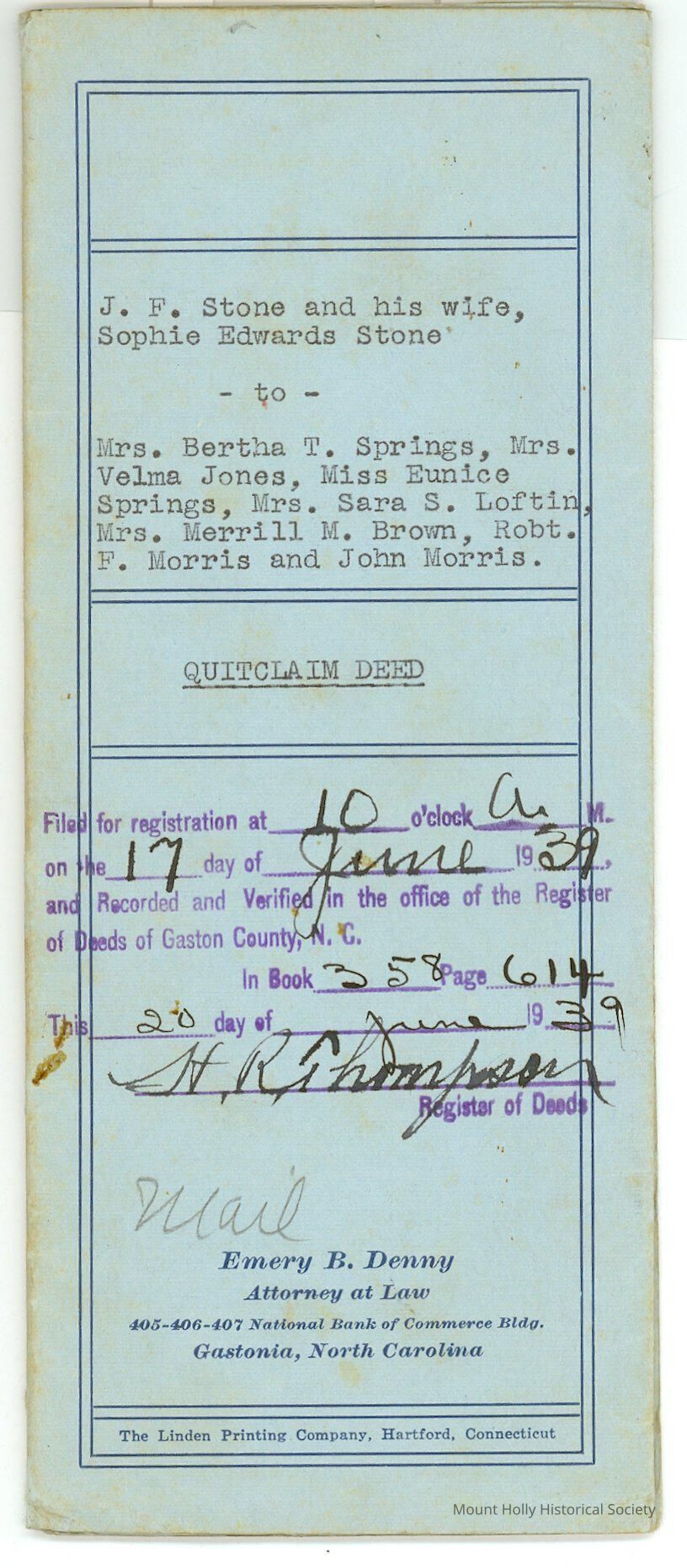 Quitclaim deed of J.F. & Sophie Edwards Stone to Bertha Springs, Velma Jones, et al. (Main St.)