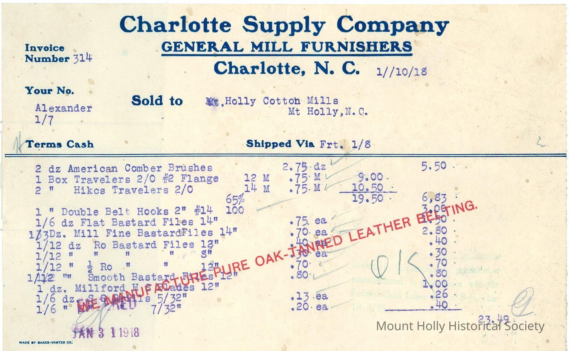 Invoice from Charlotte Supply Co. to Mt. Holly Cotton Mills for tools and equipment