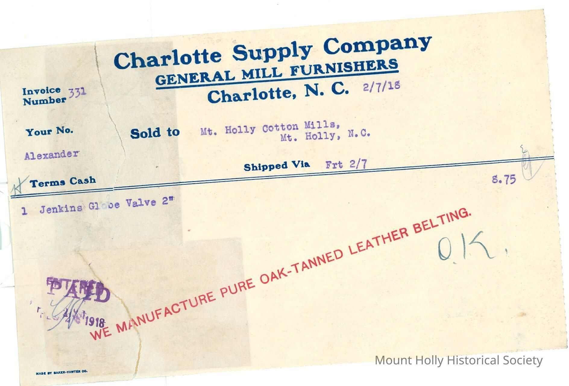 Invoice from Charlotte Supply Co. to Mt. Holly Cotton Mills for one Jenkins globe valve