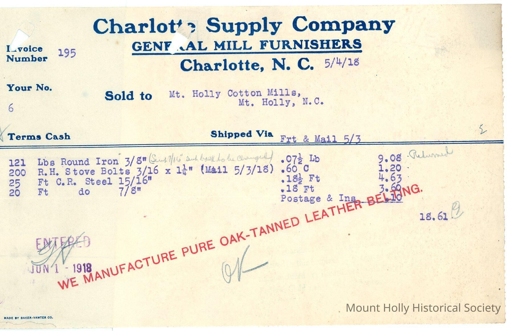 Invoice from Charlotte Supply Co. to Mt. Holly Cotton Mills for bolts and steel