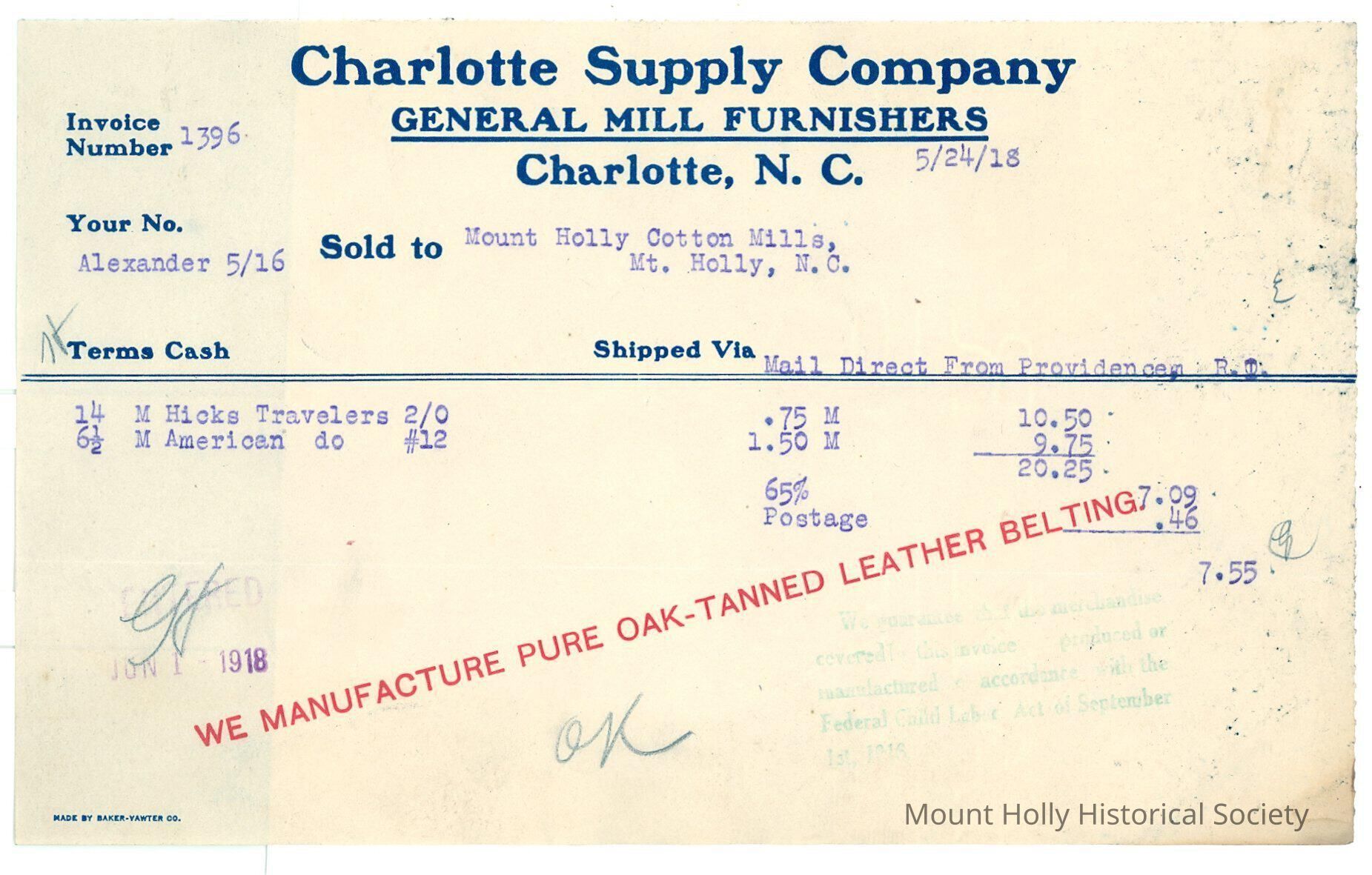 Invoice from Charlotte Supply Co. to Mt. Holly Cotton Mills for equipment