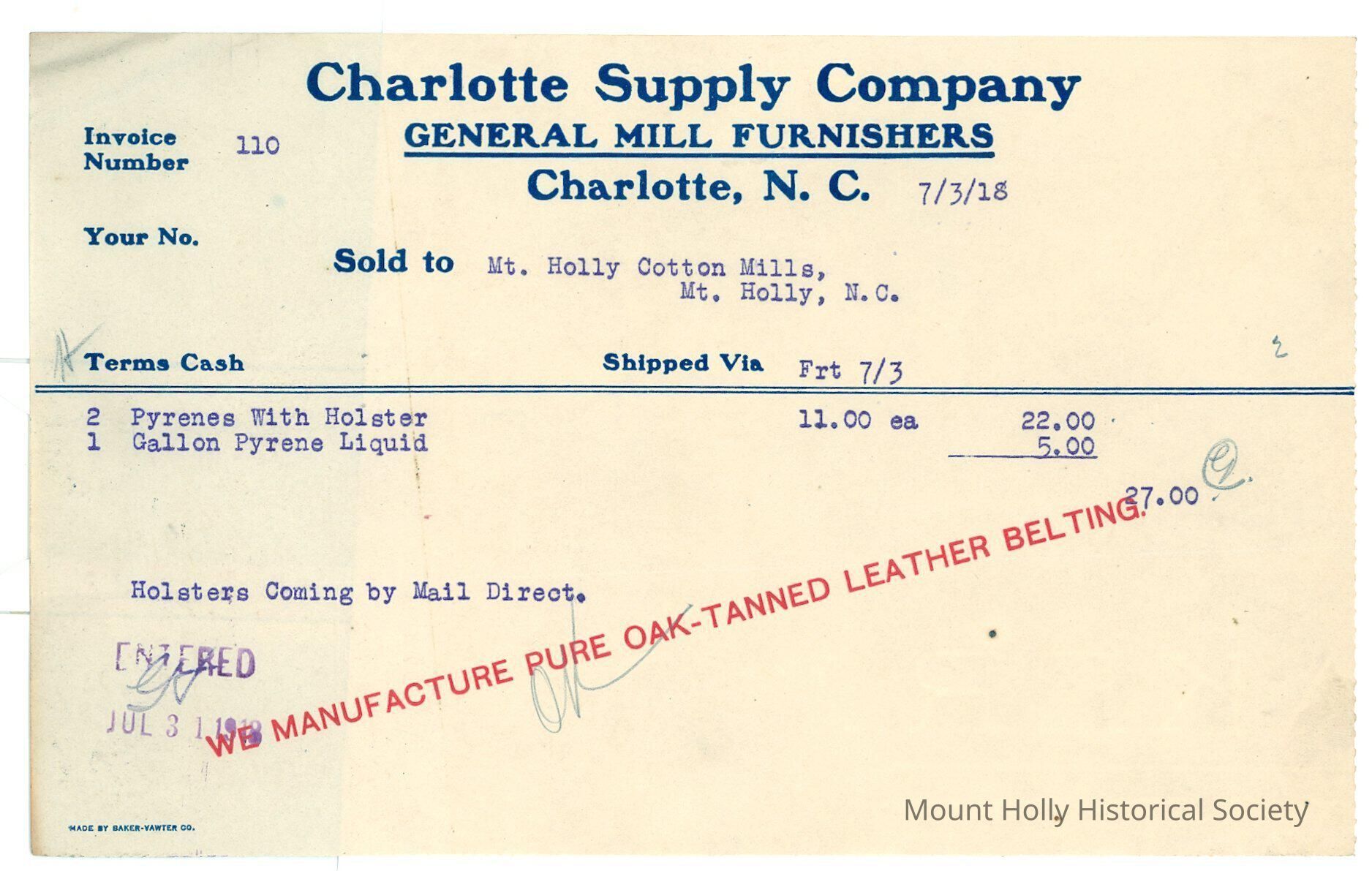 Invoice from Charlotte Supply Co. to Mt. Holly Cotton Mills for Pyrene